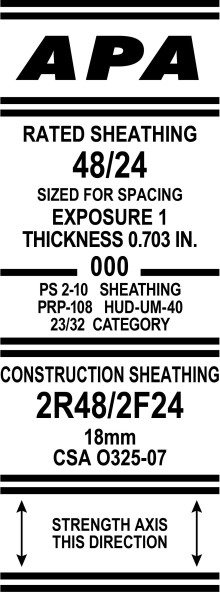 • STRENGH AXIS – THIS DIRECTION – The final block of the grade stamp means all floor and roof sheathing is designed to be applied with the long dimension perpendicular (across) the structural supports. The span ratings are based on the sheet being applied with its “strength axis” (long dimension) spanning at least three supports.