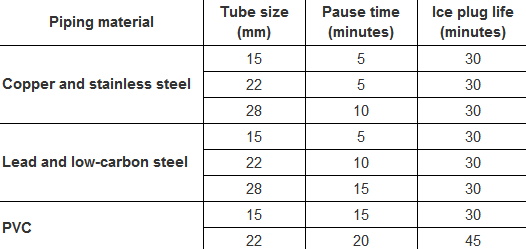 If possible, freeze horizontal rather than vertical sections of pipe. Natural heat convection within a vertical pipe can cause movement and reduce the duration of the ice plug.