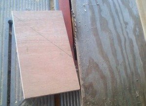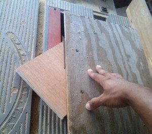 To make accurate angled cuts on a table saw, rip a piece of wood to be used as a guide. Mark the piece to be cut.